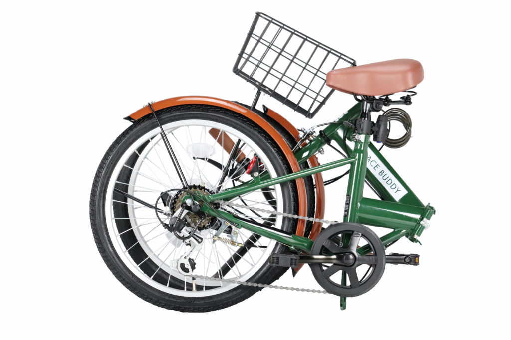 折りたたみジュニアサイクル。6段切替、前後泥除け、カゴ、ライト、カギを標準装備