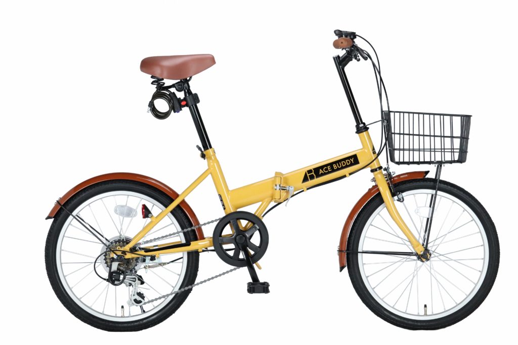 タイヤサイズ20インチの折り畳み自転車。ワイヤー錠とLEDライト、前カゴが標準装備。
